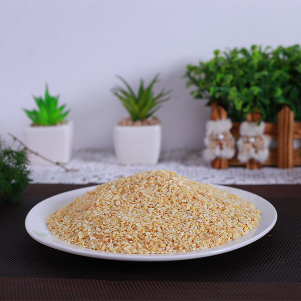 脱水蒜粒是选用优质大蒜经过精选去皮、淘洗、烤干、精选、磨粒等工序加工而成的调味品,蒜粒颜色微黄鲜亮,无黑点,水分含量低于6%,无农药残留,微生物检测不超标,不添加任何食品添加剂、防腐剂。